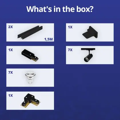 Beschreibung Bright Choice Komplettset 1-Phasen Rail L 1,5 x 1,5 Meter Schwarz | incl. 7x Spot + GU10 2700K 3W Dimmbar + Abschlusskappe, Stromanschluss und L -Verbinder
