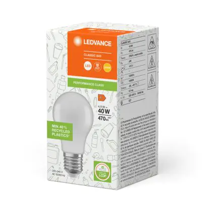 Die Ledvance Classic LED E27 Birne Matt 4.9W 470lm - 827 Extra Warmweiß | Ersatz Für 40W - Recycelt ist eine effiziente E27 LED-Lampe und der perfekte Ersatz für Ihre konventionellen 40W Lampen mit E27-Sockel. Zudem strahlt sie Licht in der Farbtemperatur 2700K - Extra Warmweiß aus und punktet durch eine lange Lebensdauer.