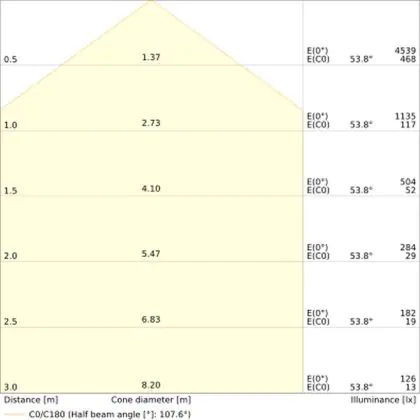 Der Abstrahlwinkel bezeichnet den Winkel, in dem das Licht aus der Lichtquelle ausgestrahlt wird. Er wird in Grad (D) angegeben. Je geringer die Gradzahl des Abstrahlwinkels ist, desto kleiner ist auch der Durchmesser des Lichtkegels, den die Lichtquelle produziert. Beispiel: Wird eine Lampe mit einem Abstrahlwinkel von 60 Grad an der Decke (2,5 m Höhe) angebracht, erzeugt sie einen Lichtkegel von 2,9 Metern Durchmesser. Hat die Lampe hingegen einen Abstrahlwinkel von 120 Grad, beträgt der Lichtkegel 8,7 Meter im Durchmesser. |