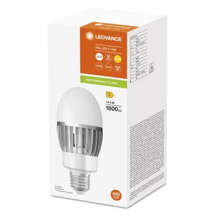 Die Ledvance LED Glühbirne HQL LED P E27 14.5W 1800lm - 827 Extra Warmweiß | Ersatz für 50W ist eine effiziente HQL LED-Lampe und der perfekte Ersatz für Ihre konventionelle HQL-Gasentladungslampe. Zudem strahlt das Produkt Licht in der Farbtemperatur 2700K - Extra Warmweiß aus und punktet durch eine lange Lebensdauer.
