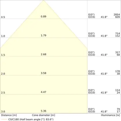 Der Abstrahlwinkel bezeichnet den Winkel, in dem das Licht aus der Lichtquelle ausgestrahlt wird. Er wird in Grad (D) angegeben. Je geringer die Gradzahl des Abstrahlwinkels ist, desto kleiner ist auch der Durchmesser des Lichtkegels, den die Lichtquelle produziert. Beispiel: Wird eine Lampe mit einem Abstrahlwinkel von 60 Grad an der Decke (2,5 m Höhe) angebracht, erzeugt sie einen Lichtkegel von 2,9 Metern Durchmesser. Hat die Lampe hingegen einen Abstrahlwinkel von 120 Grad, beträgt der Lichtkegel 8,7 Meter im Durchmesser. |