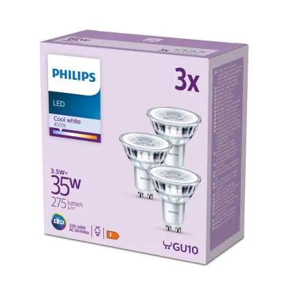 | Herstellername | Box 3 stuks - Philips LED Spot - 35 W - GU10 - Koelwit licht | |