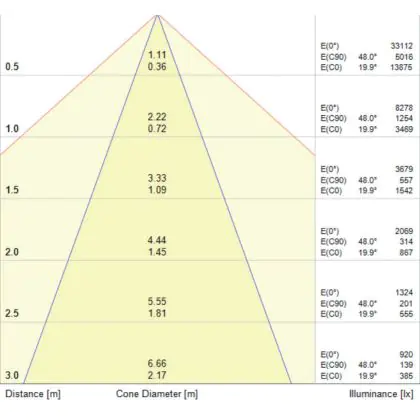 Der Abstrahlwinkel bezeichnet den Winkel, in dem das Licht aus der Lichtquelle ausgestrahlt wird. Er wird in Grad (D) angegeben. Je geringer die Gradzahl des Abstrahlwinkels ist, desto kleiner ist auch der Durchmesser des Lichtkegels, den die Lichtquelle produziert. Beispiel: Wird eine Lampe mit einem Abstrahlwinkel von 60 Grad an der Decke (2,5 m Höhe) angebracht, erzeugt sie einen Lichtkegel von 2,9 Metern Durchmesser. Hat die Lampe hingegen einen Abstrahlwinkel von 120 Grad, beträgt der Lichtkegel 8,7 Meter im Durchmesser. |