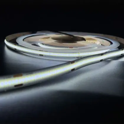 Dank der COB-Technologie ("Chip on Board") ist der LED-Streifen von Noxion mit 480 LEDs/m ausgestattet. Dies ist ein wesentlich höherer Wert als zum Beispiel bei Produkten, die mit SMD-Techonolgie daherkommen. Diese weisen entweder 60 LEDs/m oder 120 LEDs/m auf. Der Vorteil von COB: Das Licht, das der LED-Streifen ausstrahlt, wirkt wesentlich gleichmäßiger und man kann keine einzelnen Lichtquellen ausmachen.