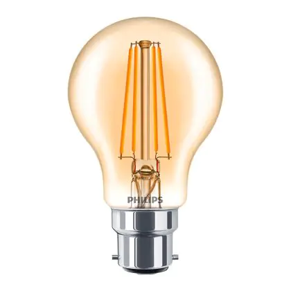 Die Philips Classic LED Glühbirne B22 Birne Gold 7.5W 610lm - 820 Extra Warmweiß | Dimmbar - Ersatz für 60W ist eine effiziente B22 LED-Lampe und der perfekte Ersatz für Ihre konventionelle Halogenlampe mit 48W und einem B22-Sockel (Bajonettsockel). Zudem strahlt das Produkt Licht in der Farbtemperatur 2000K - Extra Warmweiß aus und punktet durch eine lange Lebensdauer.
