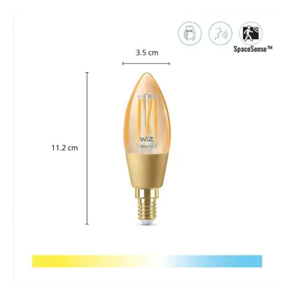 Die WiZ Smart LED E14 Kerze Fadenlampe Gold 5W 370lm | Höchste Farbwiedergabe - Dimmbar - Ersatz Für 25W ist eine effiziente E14 LED-Lampe mit Retrodesign und der perfekte Ersatz für Ihre konventionellen 25W Lampen mit E14. Zudem strahlt sie Licht in der Farbtemperatur aus und punktet durch eine lange Lebensdauer.